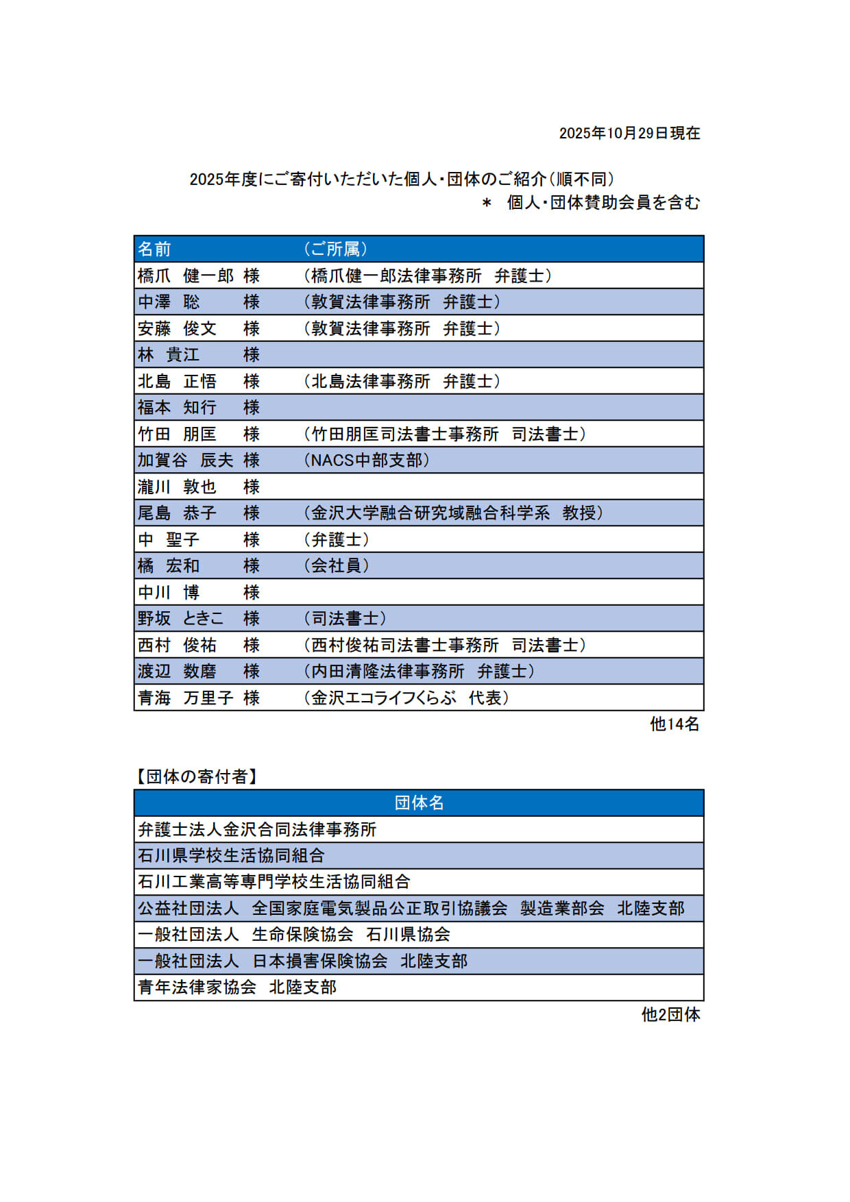 なお、ご寄付いただいた方は当会のホームページ内に、お名前と所属を掲載しますので、公表の諾否をお知らせください。